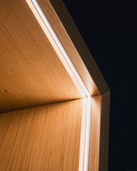 Led a luce naturale percorrono tutti i lati delle vetrine, mentre le teche sono illuminate da illuminazione sospesa.